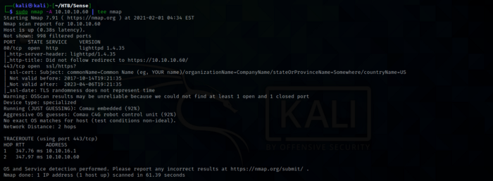 I will start with nmap and the -A parameter to enable OS detection, version detection, script scanning, and traceroute and append the output to tee command which save the in a file named “nmap” and also show the output on the screen.