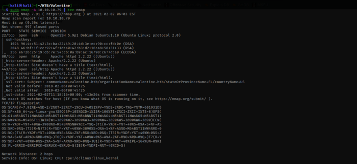 I will start with nmap and the -A parameter to enable OS detection, version detection, script scanning, and traceroute and append the output to tee command which save the in a file named “nmap” and also show the output on the screen.